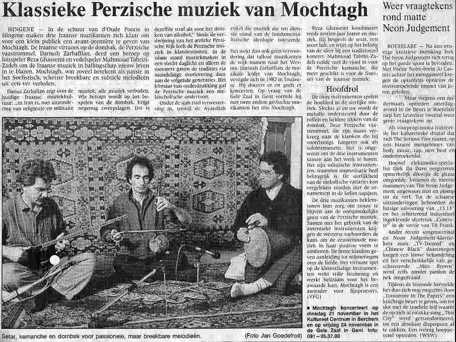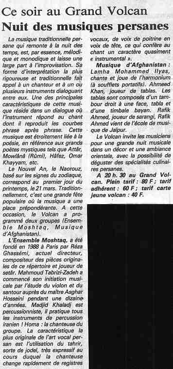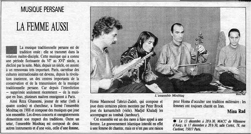 L'ensemble Moshtaq à été fondé en 1988 par Reza Ghassemi, à paris ou habitaent ses membres. il a invité plusieurs artistes iranienes, résident ou non en Frence. le célèbre chanteur Mohamad Reza Shadjarian a choisie le musiciens du groupe actuel (Reza Ghassemi, Mahmoud Tabrizi-zadeh et madjid Khaladj) pour l'accompagner au cours d'un tournée au Tadjikestan. L'ensemble a réussi à trouver une couleur personnelle, en se démarquant des tendances actuelle et en restant plus proche de la tradition de la musique savante persane.